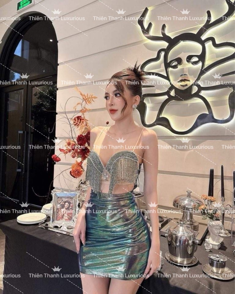 Đầm TK Body Ngắn Nhũ Cúp Ngực Khoét Bụng Đính Tua Rua