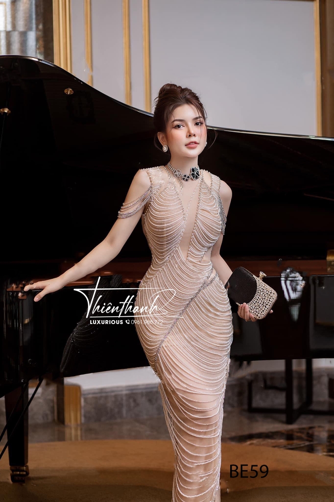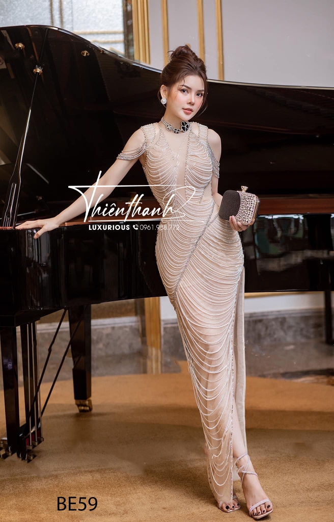 Đầm TK Dài Đính Kết Xẻ Tà Vai Rơi