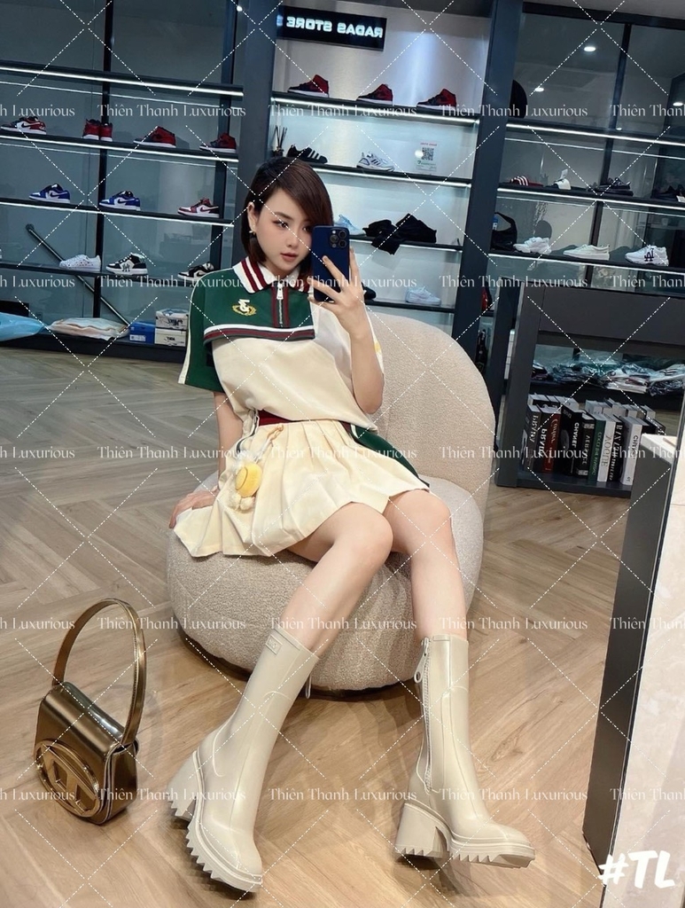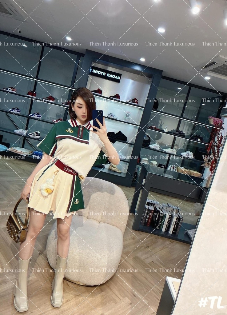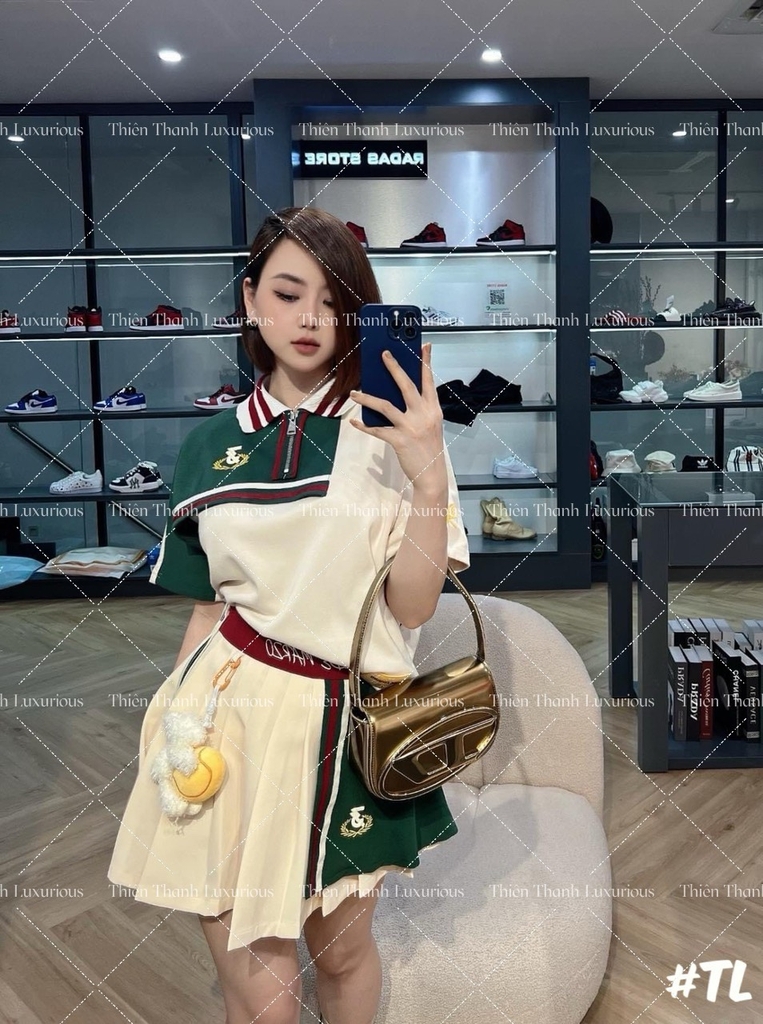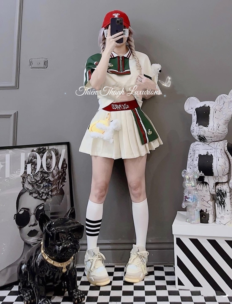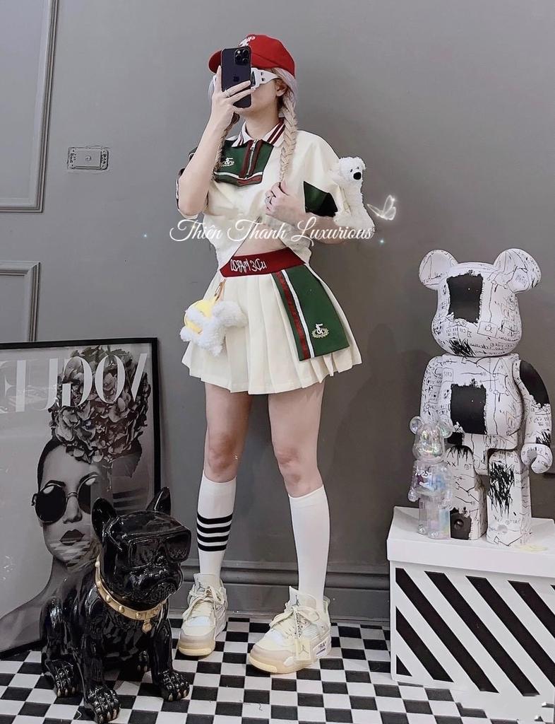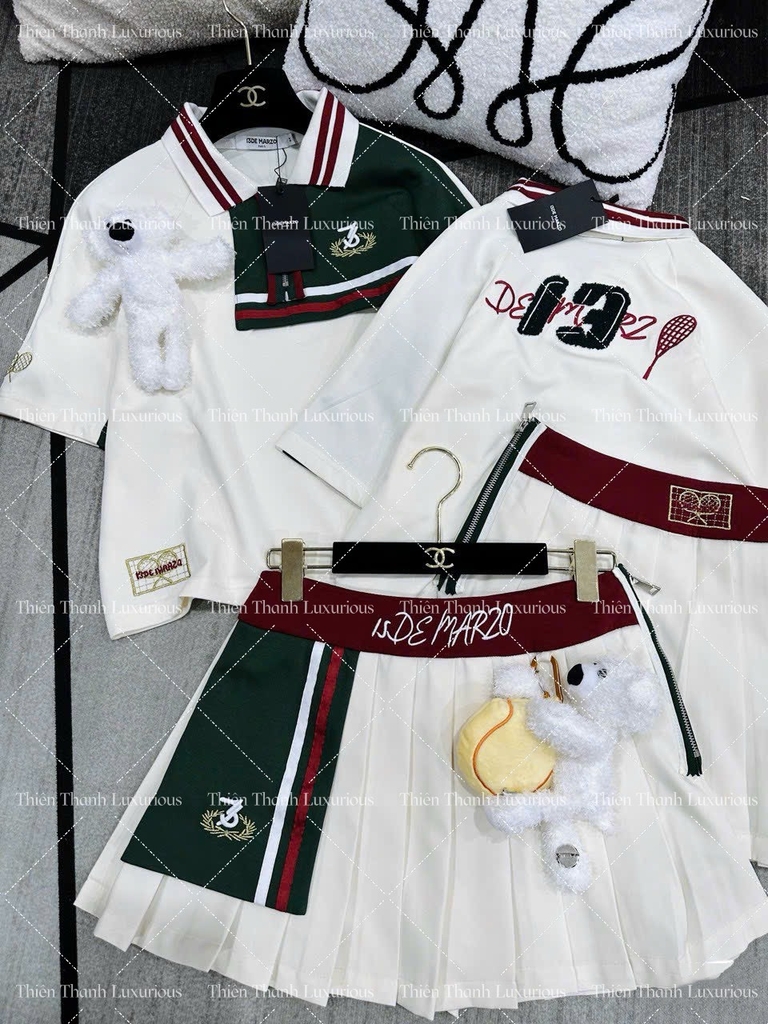 Set Áo Polo Phối Chân Váy Xếp Ly Đính Gấu Bông