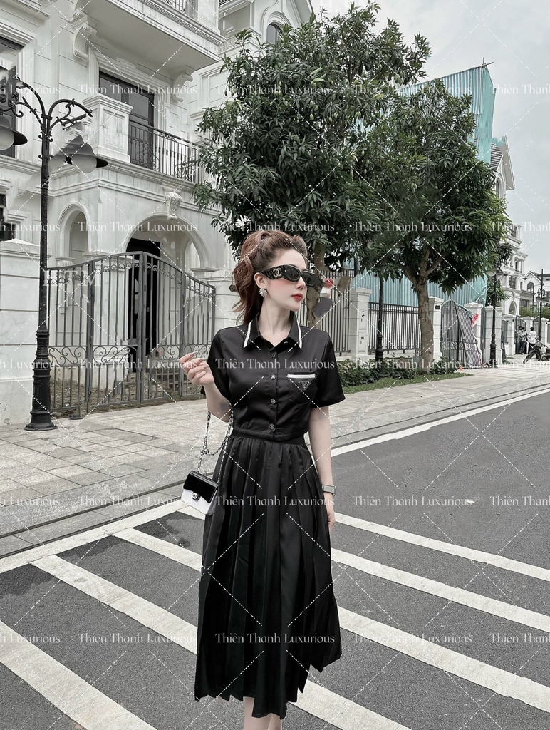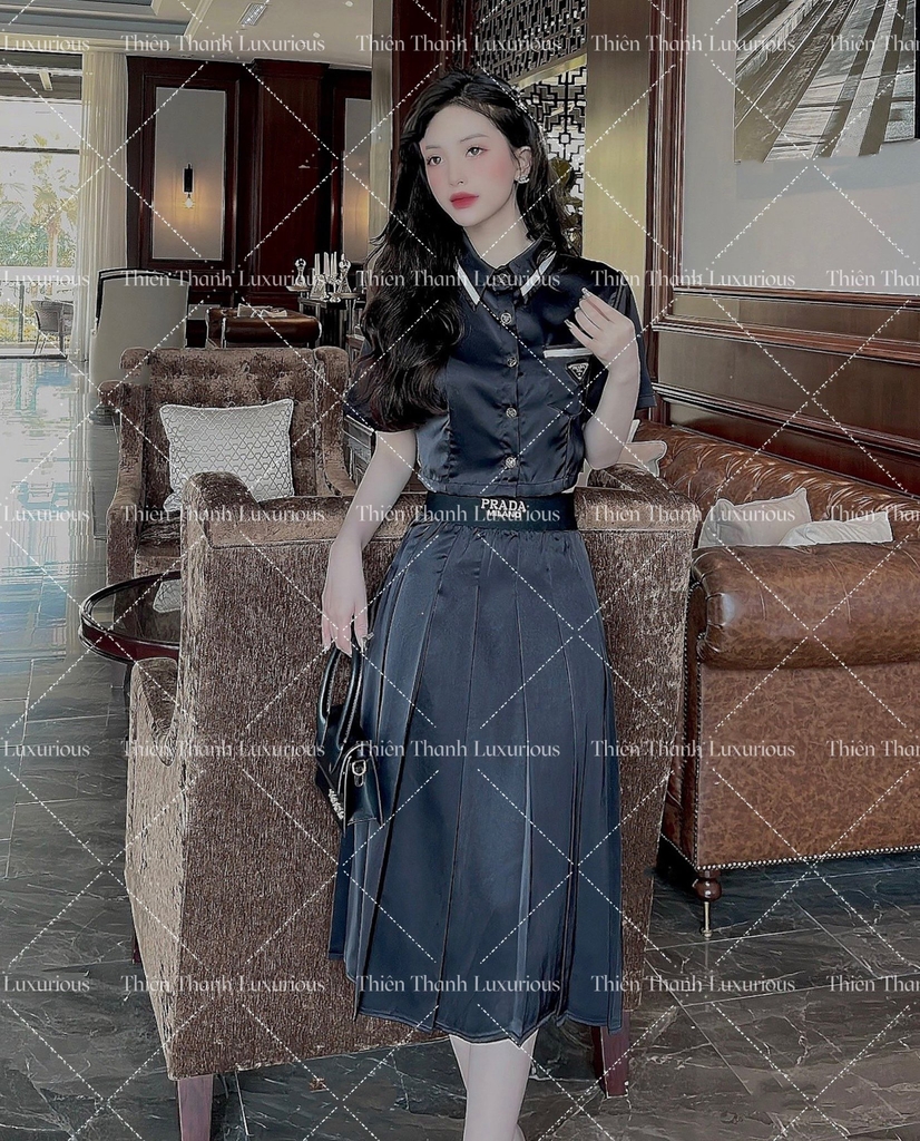 Set Áo Sơ Mi Phối Chân Váy Xoè Dài Prada